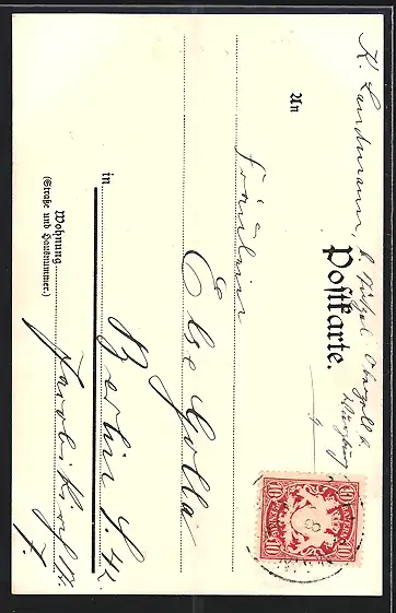 Personenbezogene Daten auf der Rückseite der Karte wurden durch blauen Textmarker unkenntlich gemacht. Die blauen Stellen sind auf die Vorderseite durchgeweicht und wirken sich negativ auf das Postkartenfoto aus