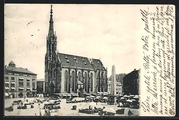 AK Würzburg, Marktplatz mit Marktbetrieb u. Kirche
