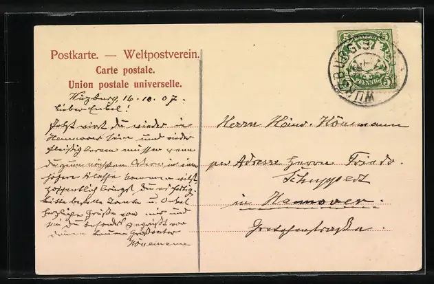 Personenbezogene Daten auf der Rückseite der Karte wurden durch blauen Textmarker unkenntlich gemacht. Die blauen Stellen sind auf die Vorderseite durchgeweicht und wirken sich negativ auf das Postkartenfoto aus