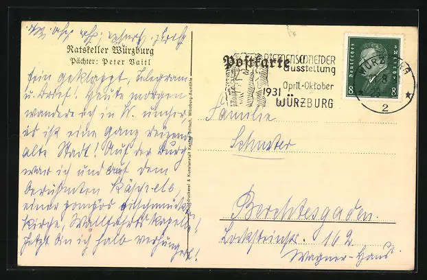 Personenbezogene Daten auf der Rückseite der Karte wurden durch blauen Textmarker unkenntlich gemacht. Die blauen Stellen sind auf die Vorderseite durchgeweicht und wirken sich negativ auf das Postkartenfoto aus
