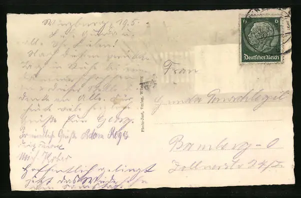Personenbezogene Daten auf der Rückseite der Karte wurden durch blauen Textmarker unkenntlich gemacht. Die blauen Stellen sind auf die Vorderseite durchgeweicht und wirken sich negativ auf das Postkartenfoto aus