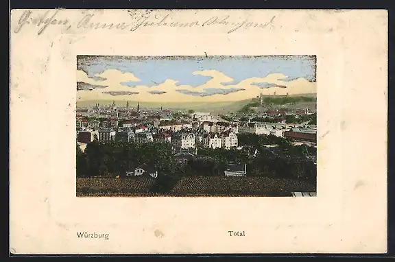 Personenbezogene Daten auf der Rückseite der Karte wurden durch blauen Textmarker unkenntlich gemacht. Die blauen Stellen sind auf die Vorderseite durchgeweicht und wirken sich negativ auf das Postkartenfoto aus