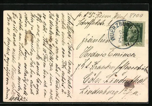 Personenbezogene Daten auf der Rückseite der Karte wurden durch blauen Textmarker unkenntlich gemacht. Die blauen Stellen sind auf die Vorderseite durchgeweicht und wirken sich negativ auf das Postkartenfoto aus