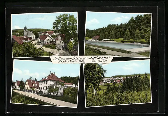 AK Wüstenrot / Württ., Ortspartie, Schwimmbad und Strassenpartie