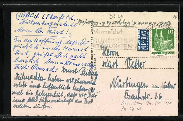 Personenbezogene Daten auf der Rückseite der Karte wurden durch blauen Textmarker unkenntlich gemacht. Die blauen Stellen sind auf die Vorderseite durchgeweicht und wirken sich negativ auf das Postkartenfoto aus