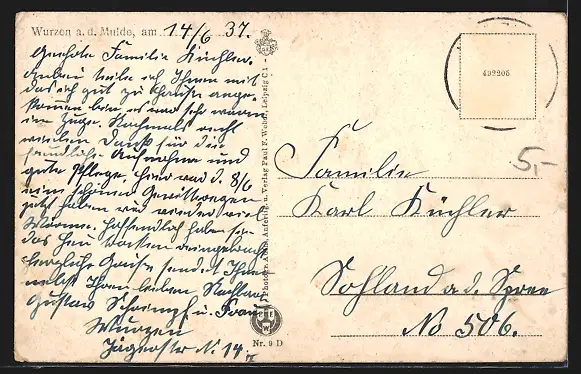 gelaufen 1937, Briefmarke entfernt, Eckknick re. unten, guter Zustand
