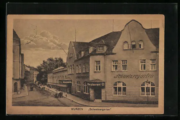 AK Wurzen, Restaurant Schweizergarten mit Strasse aus der Vogelschau