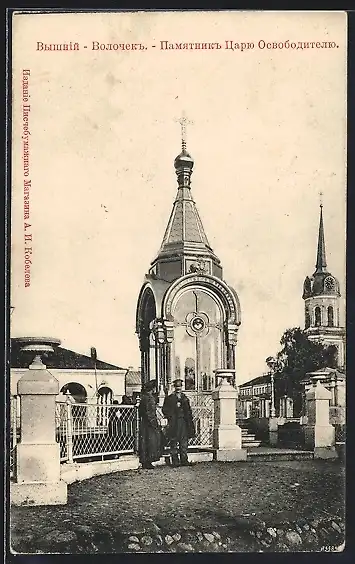 AK Wyschni Wolotschok, Denkmal des Zar-Befreiers mit Kirche im Hintergrund