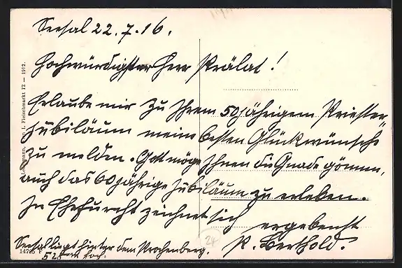Personenbezogene Daten auf der Rückseite der Karte wurden durch blauen Textmarker unkenntlich gemacht. Die blauen Stellen sind auf die Vorderseite durchgeweicht und wirken sich negativ auf das Postkartenfoto aus