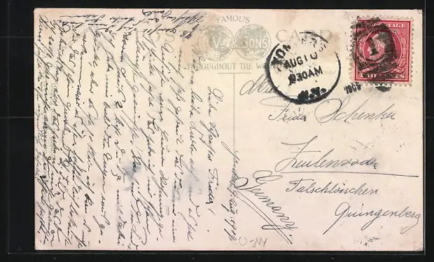 Personenbezogene Daten auf der Rückseite der Karte wurden durch blauen Textmarker unkenntlich gemacht. Die blauen Stellen sind auf die Vorderseite durchgeweicht und wirken sich negativ auf das Postkartenfoto aus