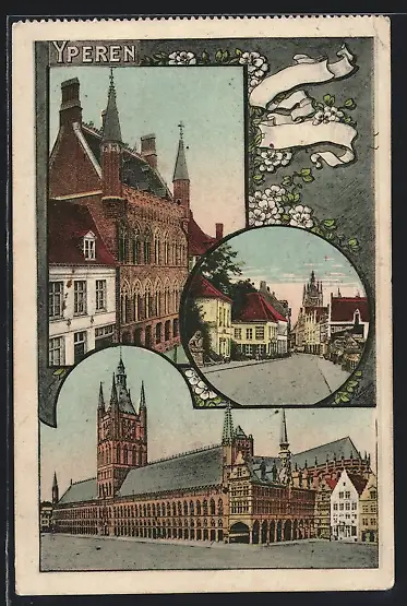 AK Yperen, Strassenpartie mit Rathaus, Wohnhäuser