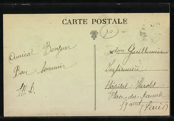 Personenbezogene Daten auf der Rückseite der Karte wurden durch blauen Textmarker unkenntlich gemacht. Die blauen Stellen sind auf die Vorderseite durchgeweicht und wirken sich negativ auf das Postkartenfoto aus
