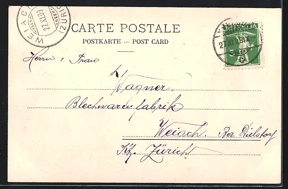 alte Ansichtskarte, gelaufen 1909, Abriebspur und kleiner Durchbruch re. unten