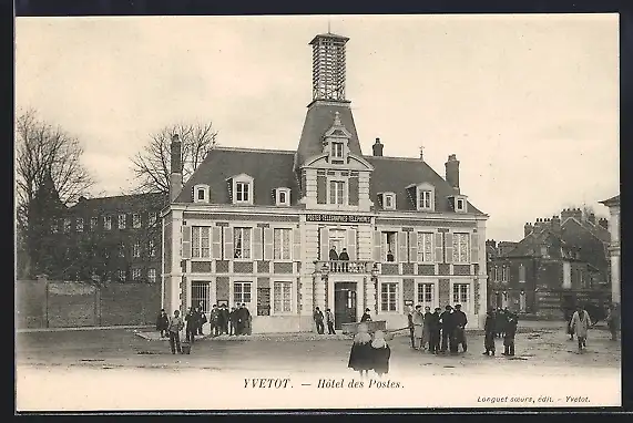 AK Yvetot, Hôtel des Postes avec groupe de personnes devant l`entrée