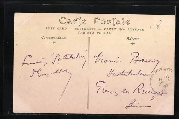 Personenbezogene Daten auf der Rückseite der Karte wurden durch blauen Textmarker unkenntlich gemacht. Die blauen Stellen sind auf die Vorderseite durchgeweicht und wirken sich negativ auf das Postkartenfoto aus