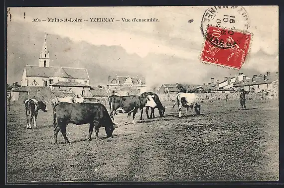 AK Yzernay, Vue d`ensemble avec église et troupeau de vaches