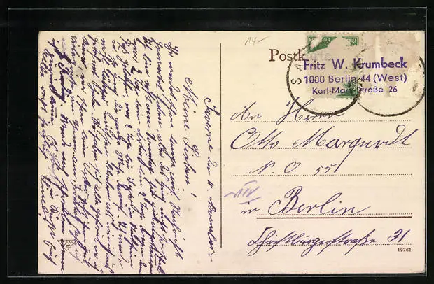 alte Ansichtskarte, gelaufen, Briefmarke tw. entfernt, rückseitig Oberflächenschaden, Stempelspur, guter Zustand