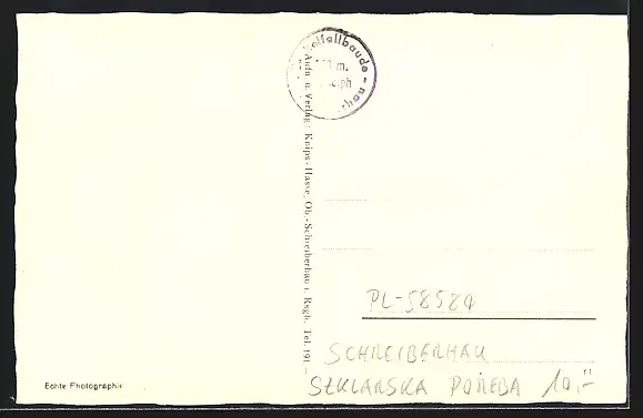 Personenbezogene Daten auf der Rückseite der Karte wurden durch blauen Textmarker unkenntlich gemacht. Die blauen Stellen sind auf die Vorderseite durchgeweicht und wirken sich negativ auf das Postkartenfoto aus