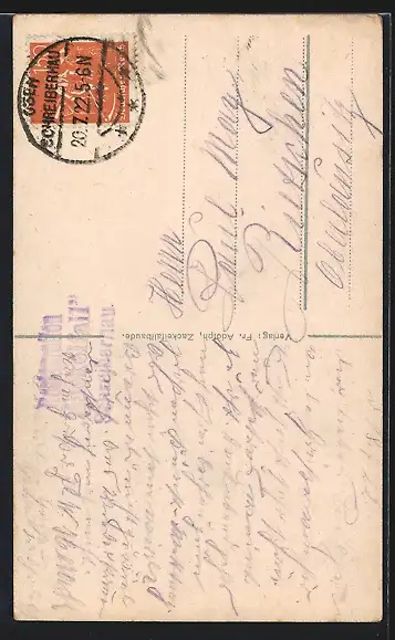 Personenbezogene Daten auf der Rückseite der Karte wurden durch blauen Textmarker unkenntlich gemacht. Die blauen Stellen sind auf die Vorderseite durchgeweicht und wirken sich negativ auf das Postkartenfoto aus
