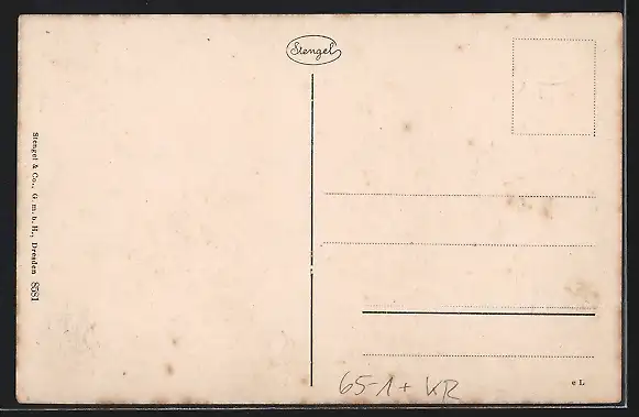 Personenbezogene Daten auf der Rückseite der Karte wurden durch blauen Textmarker unkenntlich gemacht. Die blauen Stellen sind auf die Vorderseite durchgeweicht und wirken sich negativ auf das Postkartenfoto aus