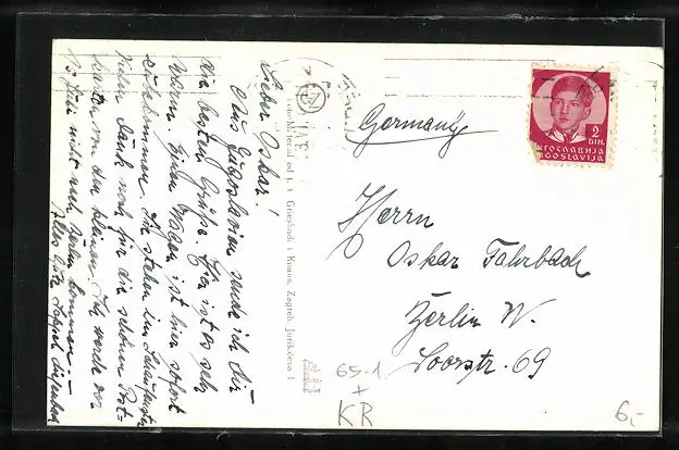 Personenbezogene Daten auf der Rückseite der Karte wurden durch blauen Textmarker unkenntlich gemacht. Die blauen Stellen sind auf die Vorderseite durchgeweicht und wirken sich negativ auf das Postkartenfoto aus