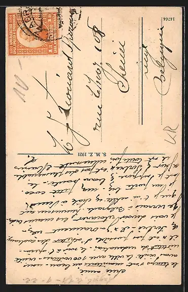 Personenbezogene Daten auf der Rückseite der Karte wurden durch blauen Textmarker unkenntlich gemacht. Die blauen Stellen sind auf die Vorderseite durchgeweicht und wirken sich negativ auf das Postkartenfoto aus