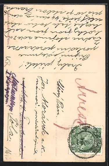 Personenbezogene Daten auf der Rückseite der Karte wurden durch blauen Textmarker unkenntlich gemacht. Die blauen Stellen sind auf die Vorderseite durchgeweicht und wirken sich negativ auf das Postkartenfoto aus