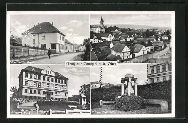 AK Zauchtel a. d. Oder, Gasthaus Breth, Bürgerschule, Kriegerdenkmal