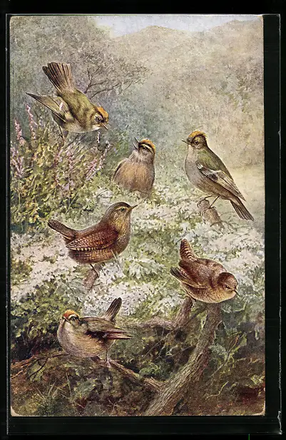 AK Zaunkönige in Frühlingslandschaft