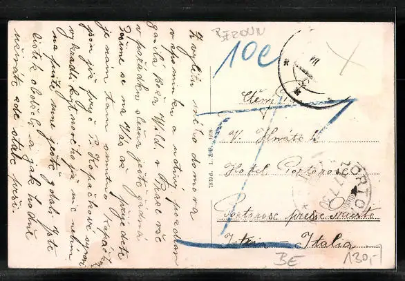 Personenbezogene Daten auf der Rückseite der Karte wurden durch blauen Textmarker unkenntlich gemacht. Die blauen Stellen sind auf die Vorderseite durchgeweicht und wirken sich negativ auf das Postkartenfoto aus