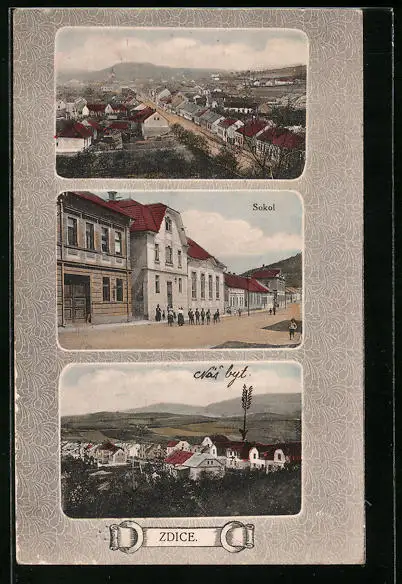 AK Zdice, Sokol, Strassenpartie aus der Vogelschau