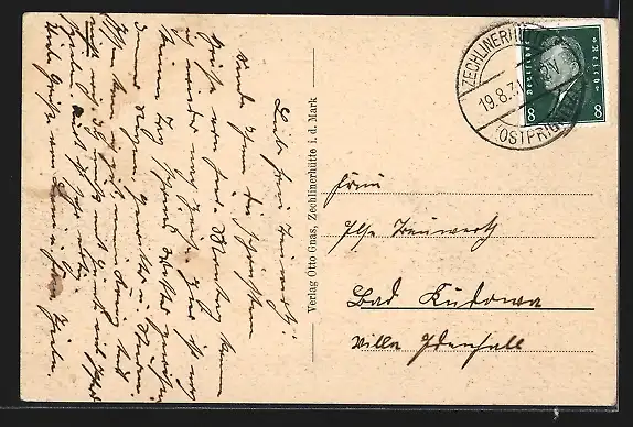Personenbezogene Daten auf der Rückseite der Karte wurden durch blauen Textmarker unkenntlich gemacht. Die blauen Stellen sind auf die Vorderseite durchgeweicht und wirken sich negativ auf das Postkartenfoto aus