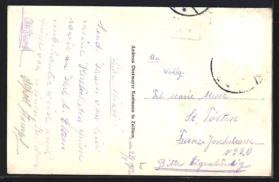 Personenbezogene Daten auf der Rückseite der Karte wurden durch blauen Textmarker unkenntlich gemacht. Die blauen Stellen sind auf die Vorderseite durchgeweicht und wirken sich negativ auf das Postkartenfoto aus