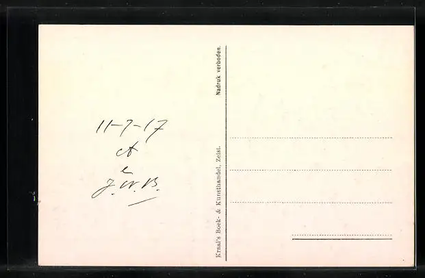 Personenbezogene Daten auf der Rückseite der Karte wurden durch blauen Textmarker unkenntlich gemacht. Die blauen Stellen sind auf die Vorderseite durchgeweicht und wirken sich negativ auf das Postkartenfoto aus