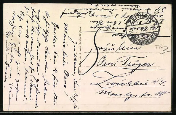 Personenbezogene Daten auf der Rückseite der Karte wurden durch blauen Textmarker unkenntlich gemacht. Die blauen Stellen sind auf die Vorderseite durchgeweicht und wirken sich negativ auf das Postkartenfoto aus