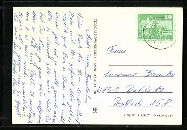 Personenbezogene Daten auf der Rückseite der Karte wurden durch blauen Textmarker unkenntlich gemacht. Die blauen Stellen sind auf die Vorderseite durchgeweicht und wirken sich negativ auf das Postkartenfoto aus