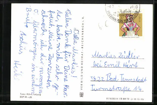 Personenbezogene Daten auf der Rückseite der Karte wurden durch blauen Textmarker unkenntlich gemacht. Die blauen Stellen sind auf die Vorderseite durchgeweicht und wirken sich negativ auf das Postkartenfoto aus