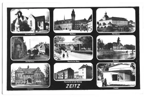 Ansichtskarte Zeitz neun Abb. - Michaeliskirche, Rathaus, Moritzburg, Am Rathaus, Wendischer Berg, Bahnhof, Volksbad, Neubauten an der Zemag, Theater Erhaltung I-II, Marke entfernt, Schrift rückseitig etwas verwischt postalisch gelaufen, gestempelt: Zeitz 2, 23.7.5[6] Druckvermerk: 1955 Herstellungsland: DDR Verlag: Lichtbild-Schinke KG, Zeitz