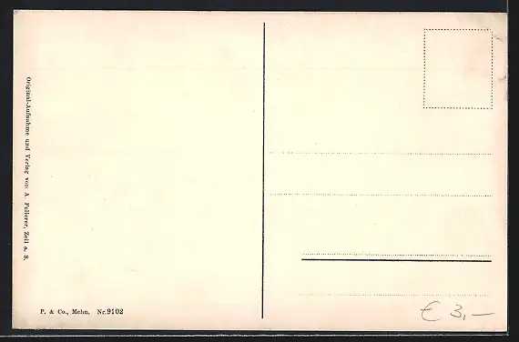 Personenbezogene Daten auf der Rückseite der Karte wurden durch blauen Textmarker unkenntlich gemacht. Die blauen Stellen sind auf die Vorderseite durchgeweicht und wirken sich negativ auf das Postkartenfoto aus