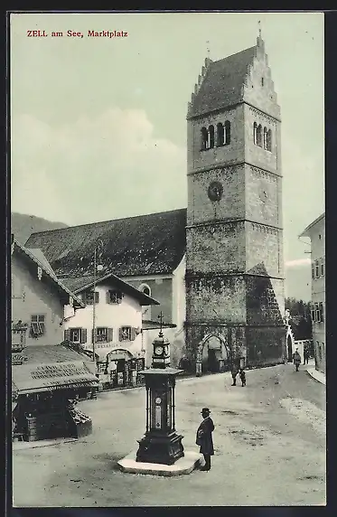 AK Zell am See, Marktplatz mit Wettersäule und Kirche