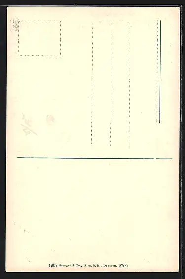 Personenbezogene Daten auf der Rückseite der Karte wurden durch blauen Textmarker unkenntlich gemacht. Die blauen Stellen sind auf die Vorderseite durchgeweicht und wirken sich negativ auf das Postkartenfoto aus