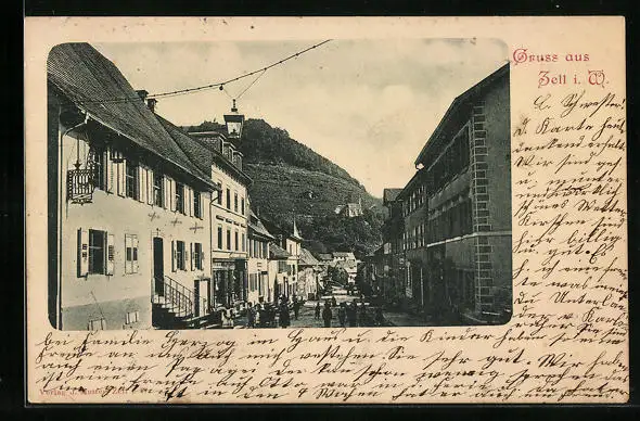 AK Zell i. W., Strassenpartie mit Kirche auf Anhöhe