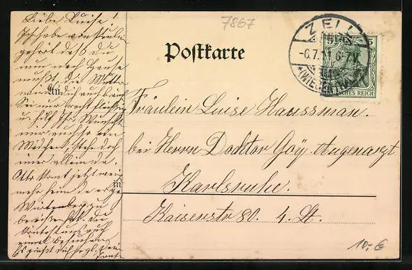 Personenbezogene Daten auf der Rückseite der Karte wurden durch blauen Textmarker unkenntlich gemacht. Die blauen Stellen sind auf die Vorderseite durchgeweicht und wirken sich negativ auf das Postkartenfoto aus