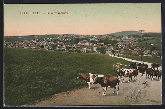 AK Zellerfeld, Gesamtansicht mit Strasse und Kuhherde