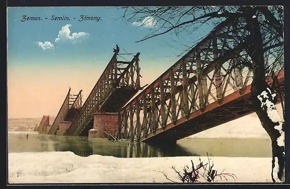 AK Zemun / Semlin, Zerstörte Brücke im Winter