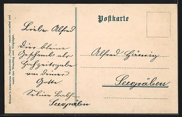 Personenbezogene Daten auf der Rückseite der Karte wurden durch blauen Textmarker unkenntlich gemacht. Die blauen Stellen sind auf die Vorderseite durchgeweicht und wirken sich negativ auf das Postkartenfoto aus