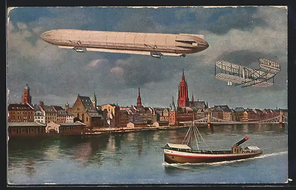 AK Zeppelin und Flugzeug über einer Stadt, Boot