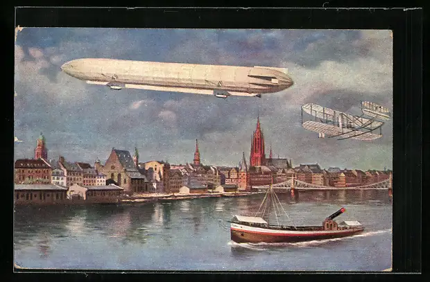 AK Zeppelinfahrt über die Stadt in Begleitung eines Flugzeuges
