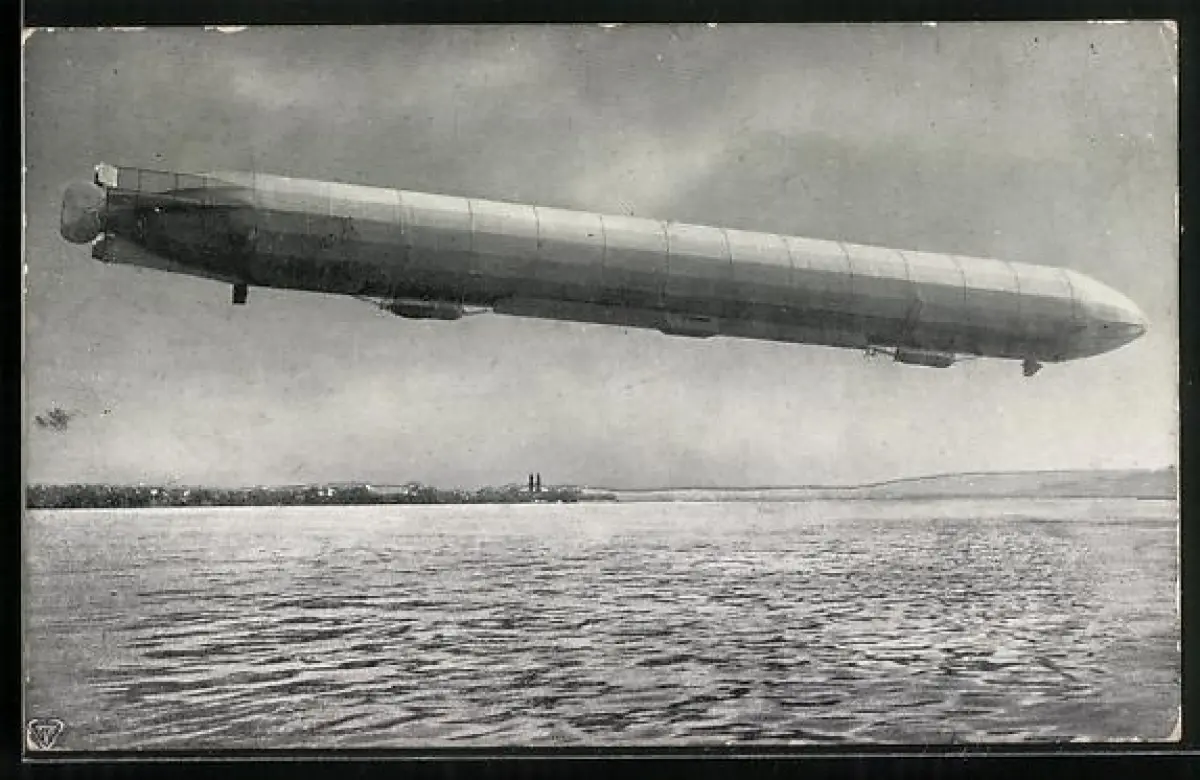AK Zeppelins Luftschiff im Fluge, Zeppelin im Flug über dem Wasser