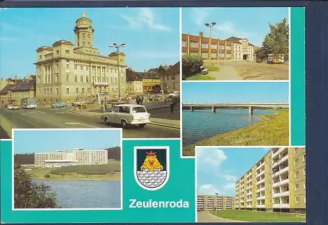 AK Zeulenroda 5.Ansichten Rathaus - Blick zum FDGB Erholungsheim Talsperre Zeulenroda - Kreiskulturhaus Deutsch Sowjetische Freundschaft - Brücke über die Talsperre - Neubaugebiet Rötlein, nicht gelaufen von ca. 1984